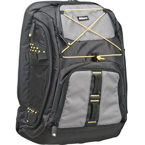 The Nikon 5877 Impact and Weather Resistant Backpack is a heavy-duty storage solution designed to house a professional DSLR kit along with a large laptop. It is characterized by its dark gray exterior and a specialized impact-resistant base that prevents the bag from toppling over while protecting gear from moisture.