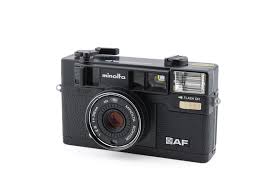 The Minolta Hi-Matic AF (1979) is a classic 35mm point-and-shoot camera, widely recognized as one of the first to feature autofocus technology. Known for its sharp 38mm f/2.8 Rokkor lens, it offers fully automatic exposure with manual film advance and rewind, requiring 2x AA batteries. It is a simple, durable camera ideal for street photography.