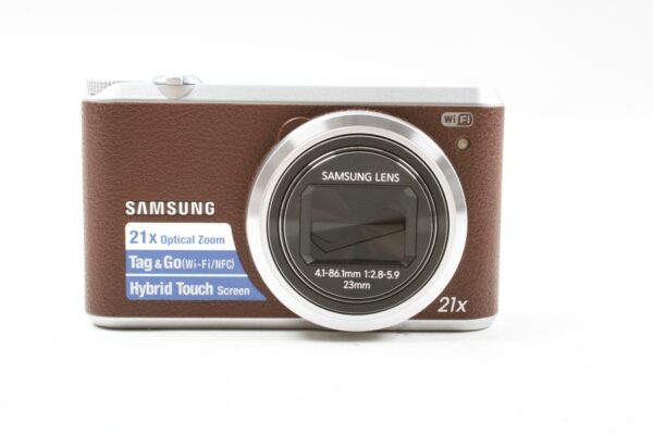 The Samsung WB350F is a 16.3-megapixel compact travel-zoom camera featuring a 21x optical zoom lens (equivalent), 3-inch touch LCD, and built-in Wi-Fi/NFC for sharing. It shoots 1080p Full HD video, includes optical image stabilization, and offers manual controls in a lightweight, retro-styled body.
